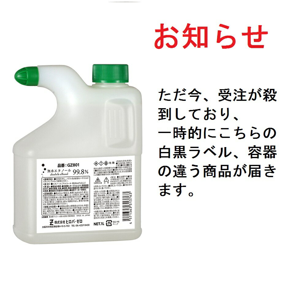 ヒロバ・ゼロ 無水エタノール 1L(アルコール99.8vol%以上)無水アルコール/油汚れ落とし/溶剤/洗浄剤/除菌/キャンセル・変更・返品不可(住所・数量・名前・支払い方法など変更不可)